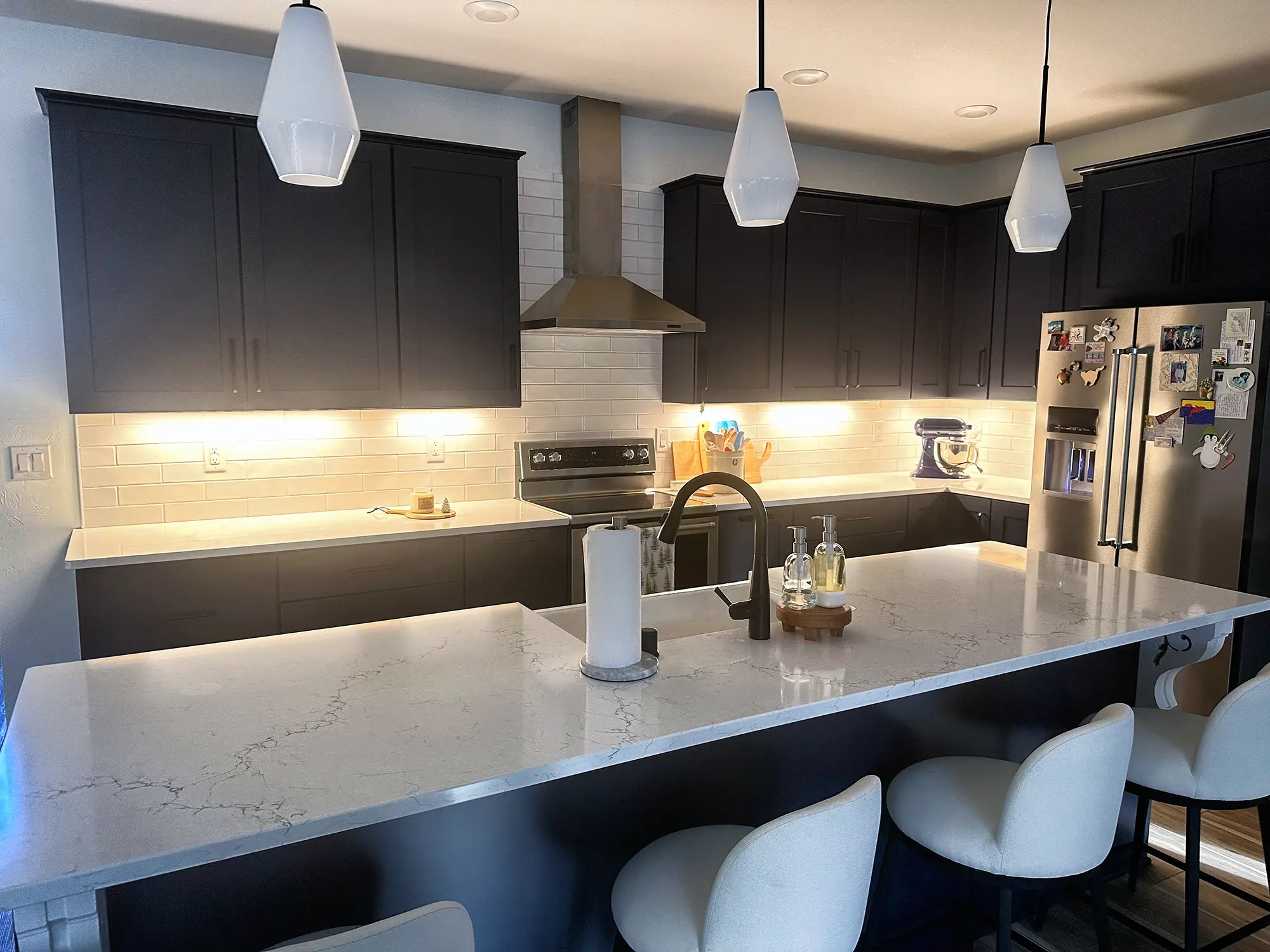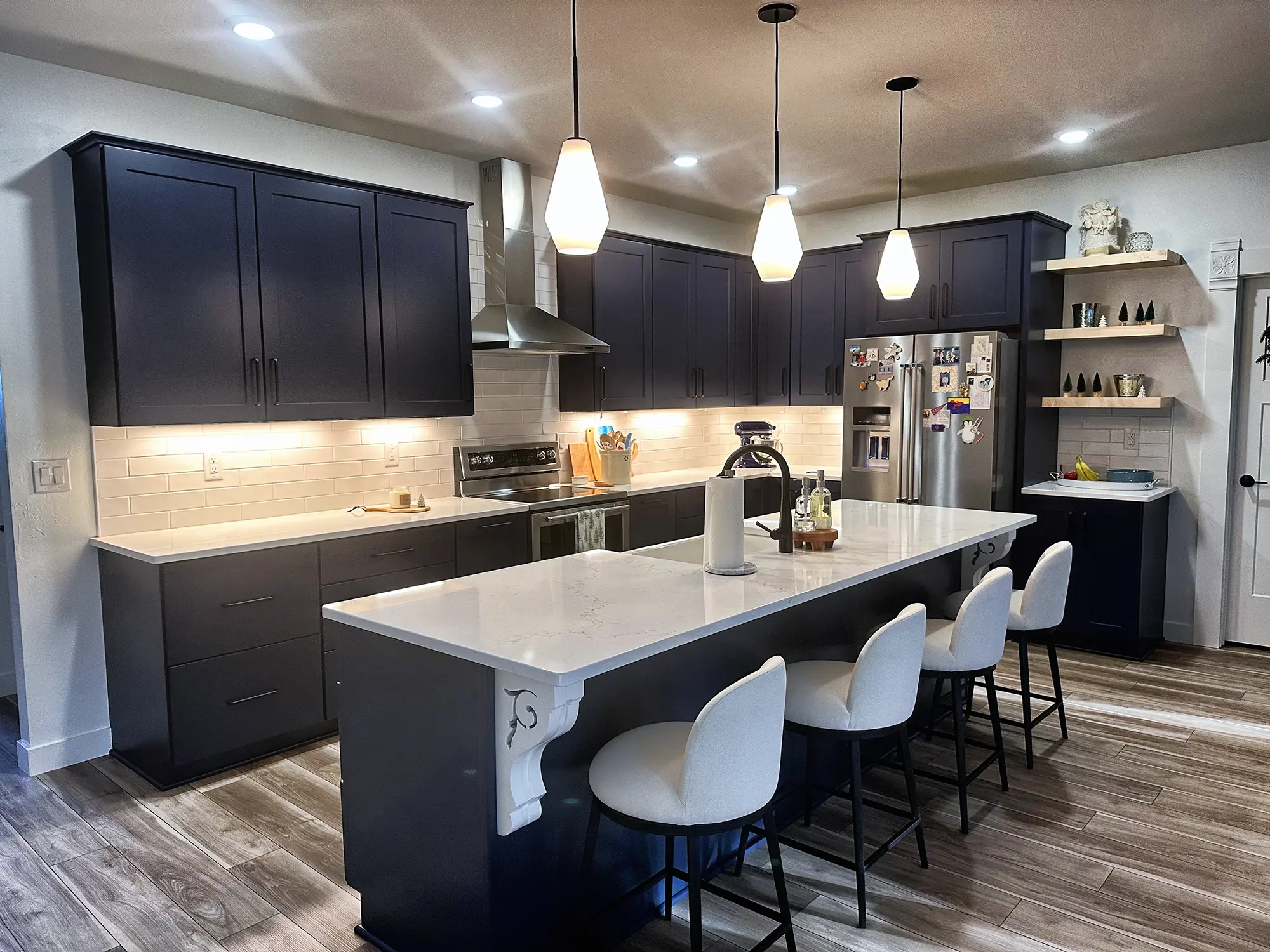 This custom designed modern farmhouse was designed to fit a front-sloping, fully wooded lot which allows the owners to enjoy the great vistas available to them while maintaining the serenity of its natural setting. Due to the lot’s features, we made substantial investment to make sure the house was placed in the optimum location to take advantage of the best access to the design the customers wanted.