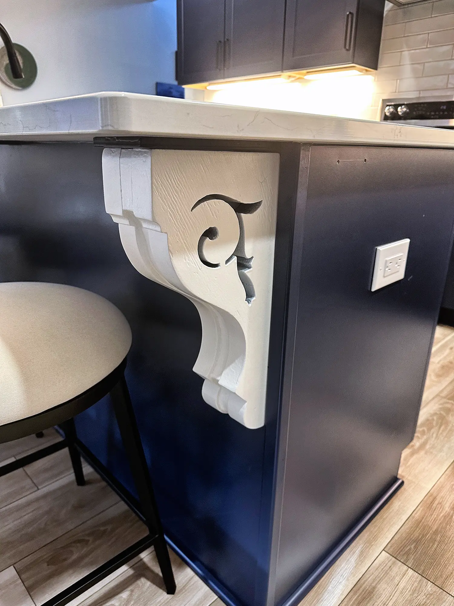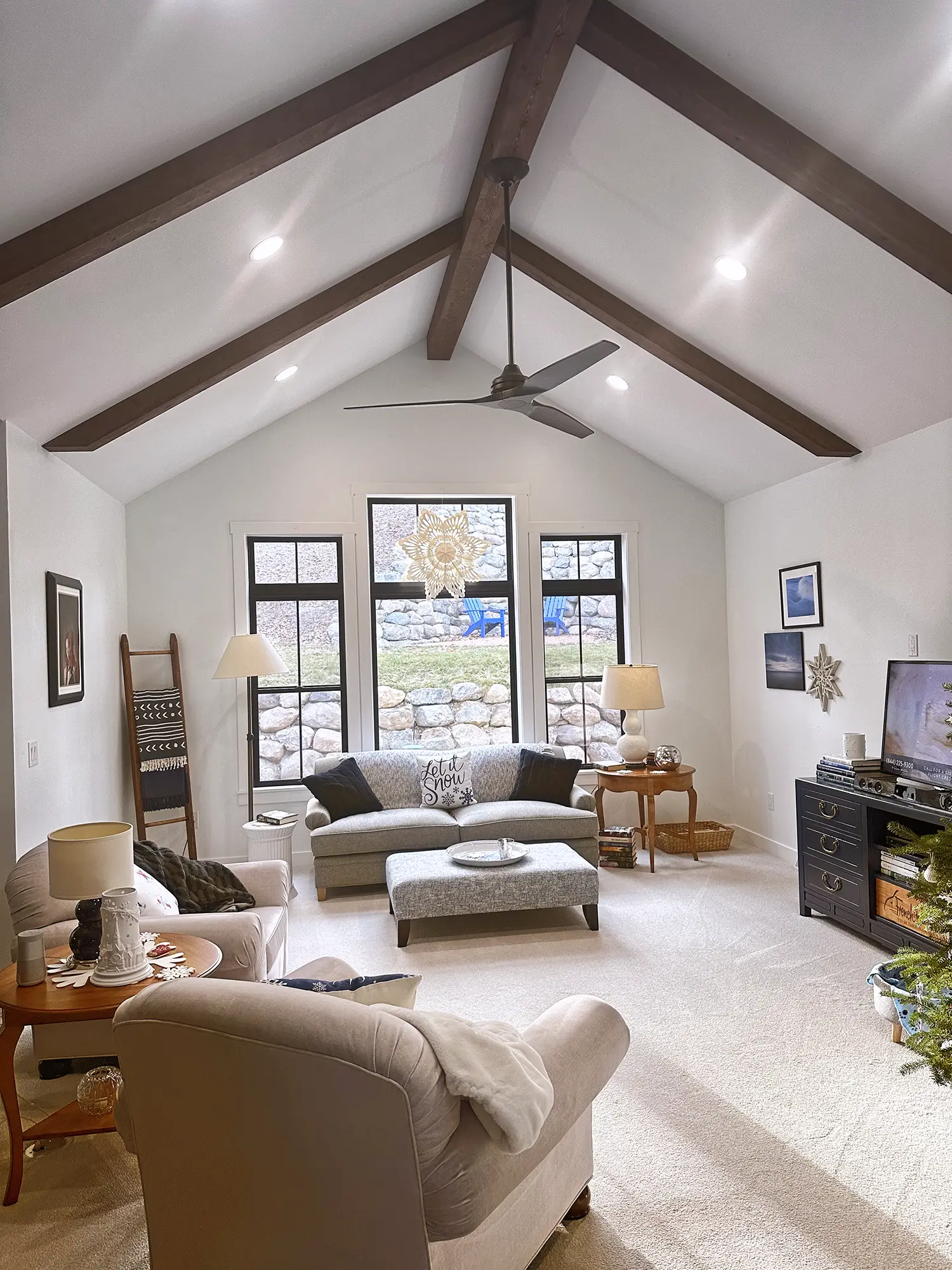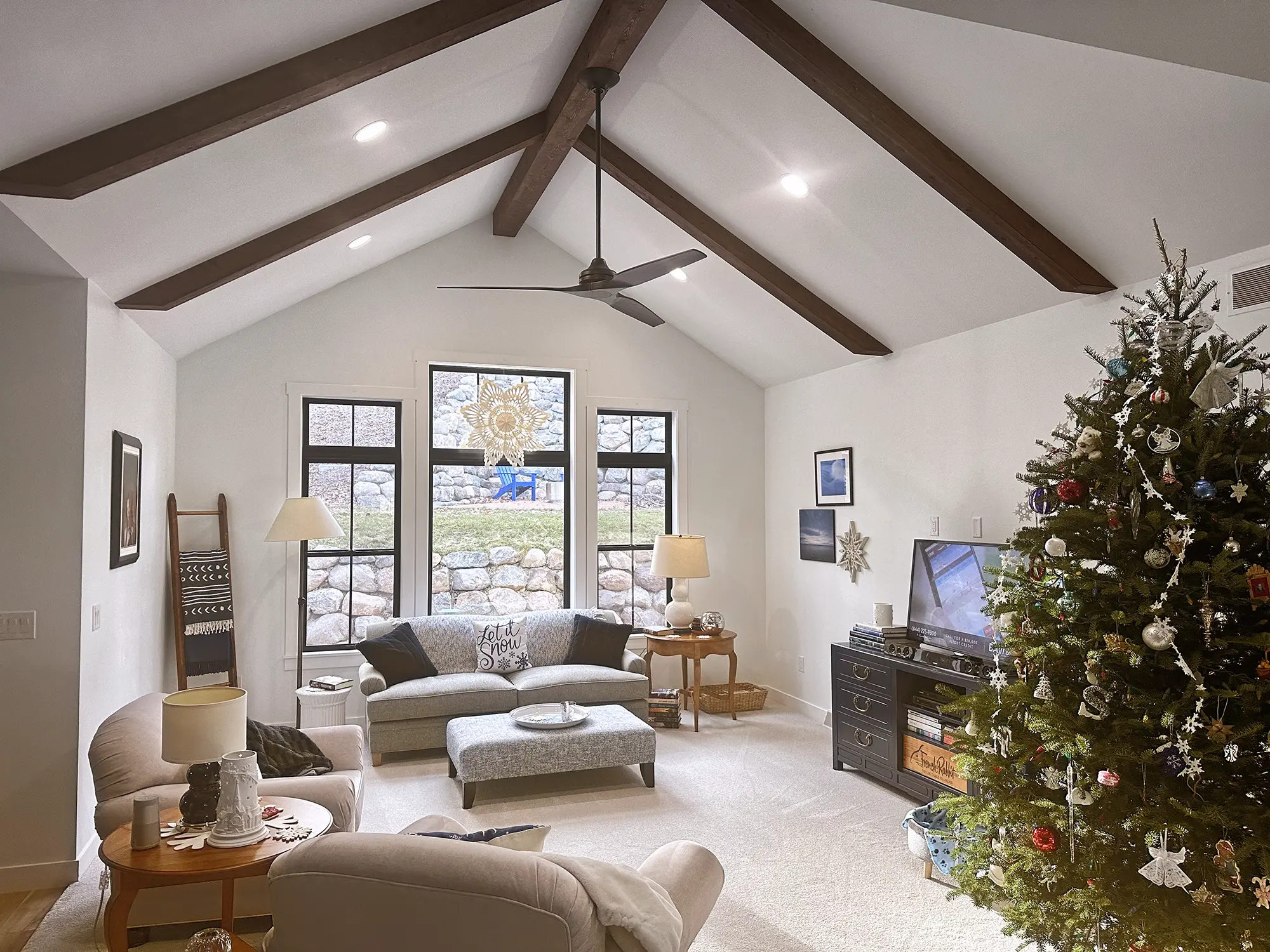 The homeowners wanted a volume entryway with natural light that opened up to ten-foot ceilings in the Great Room at the rear of the house so they could enjoy the undisturbed nature of the wooded lot. We incorporated wood beam accents into the vaulted Great Room ceiling.